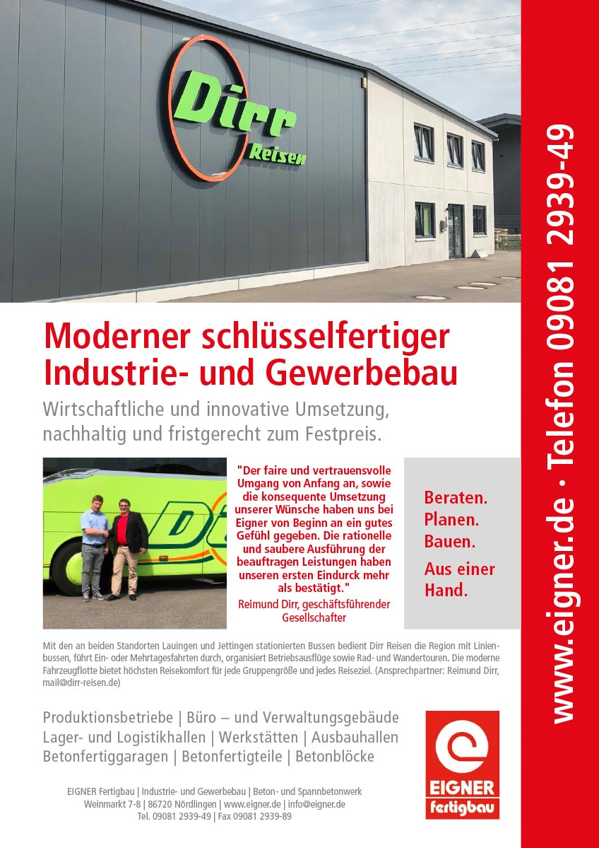 „Für unsere Sondertransporte benötigen wir eine ganz auf unsere Bedürfnisse zugeschnittene Lagerhalle für die Zwischenlagerung. Mit Herrn Christ und seinem Team hat es uns richtig Spaß gemacht das Lagerkonzept hierfür zu entwickeln. Für die schnelle und unkomplizierte Umsetzung von hochwertigen Gewerbebauten ist Eigner bekannt und dies können wir nur bestätigen."